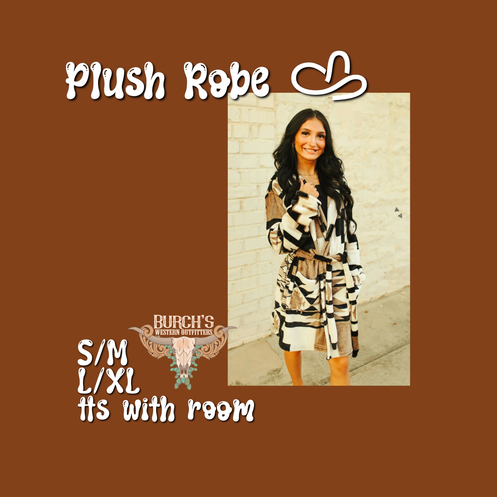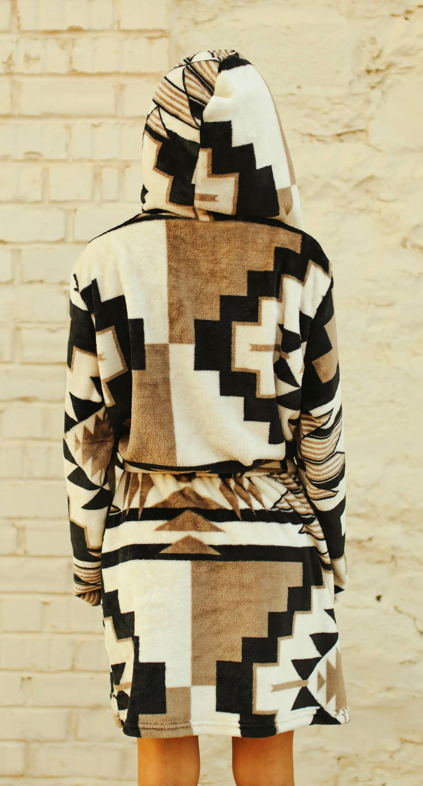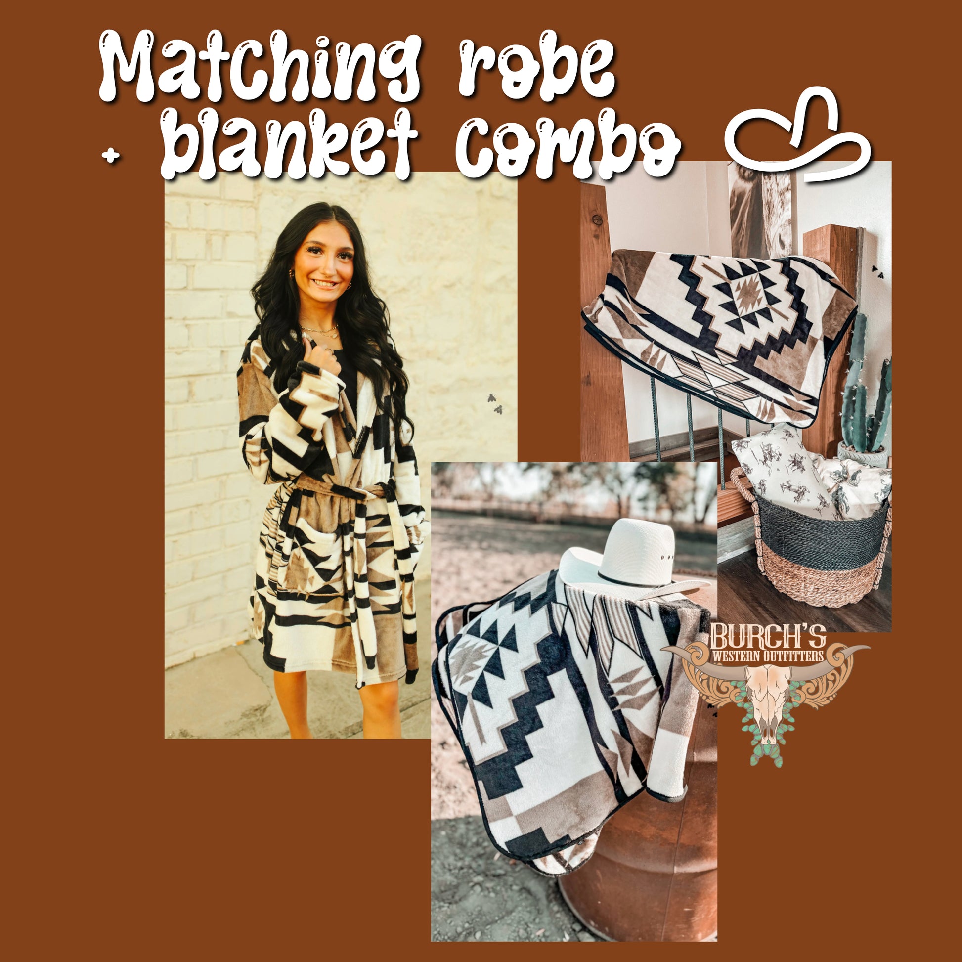 Soft plush robe with matching blanket in desert sands Aztec. Only 3 sets available with each size. Blanket size is 60.5x62. Robe fits TTS with room.