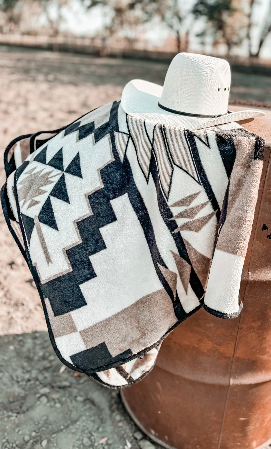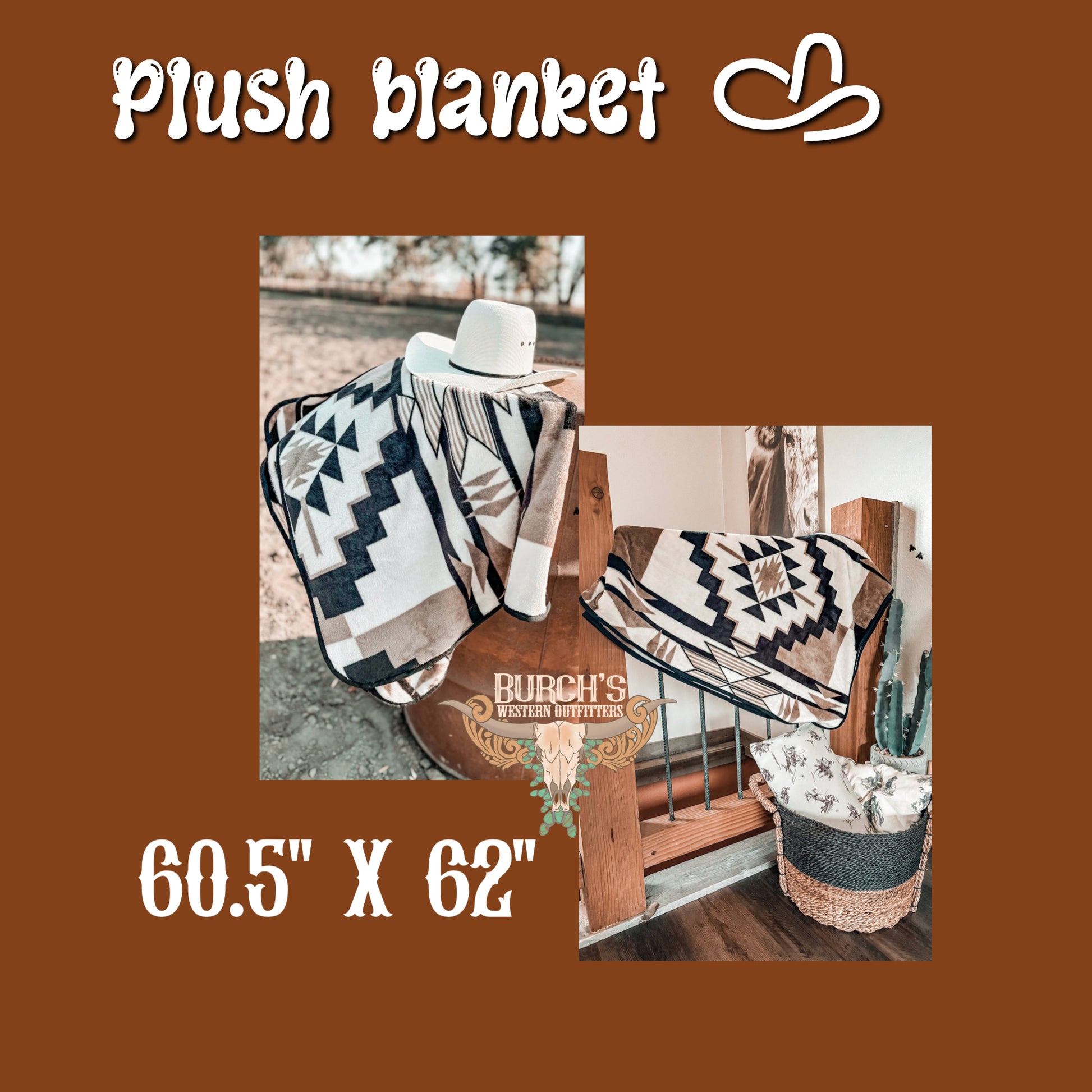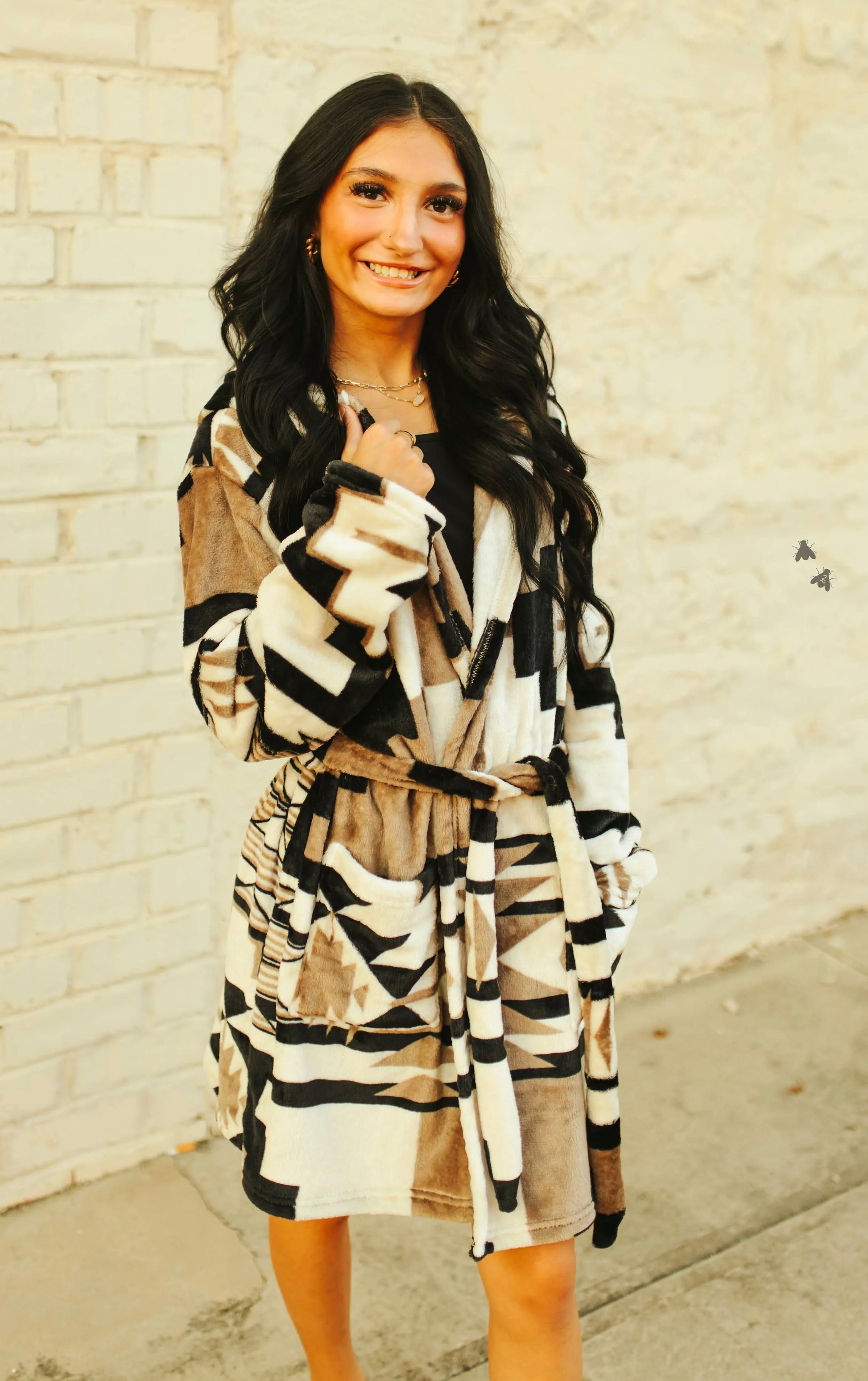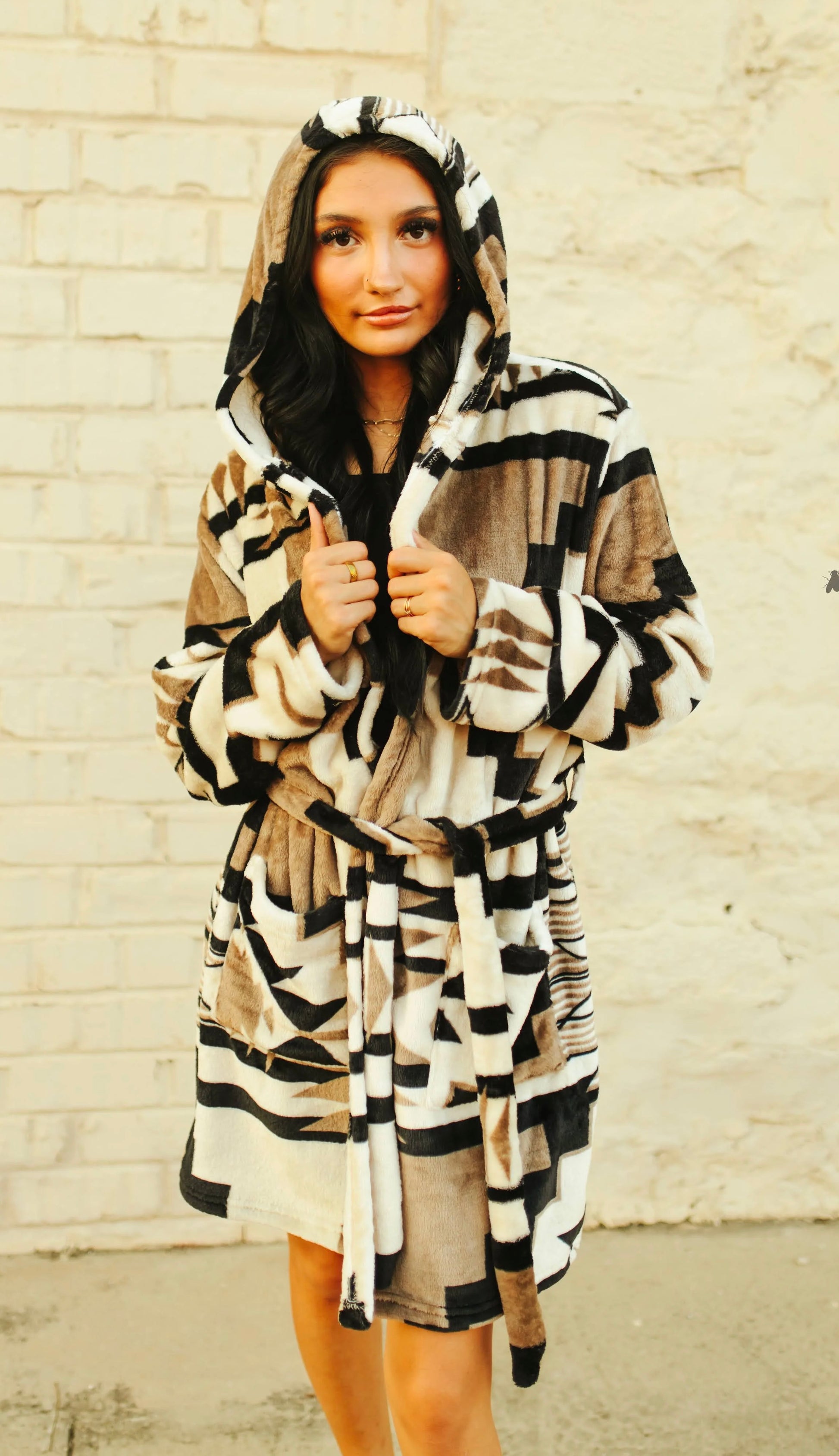 Soft plush robe with matching blanket in desert sands Aztec. Only 3 sets available with each size. Blanket size is 60.5x62. Robe fits TTS with room.